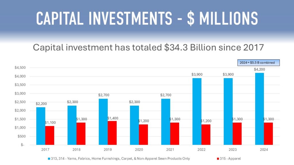 The U.S. textile industry remains globally competitive due to the continued investment in the domestic industry. The industry invested $34.3 billion in new plants and equipment from 2017 to 2024. Investment is required in processes as well as product development. Recently producers have opened new fiber, yarn, and recycling facilities to convert textile and other waste to new textile uses and resins. Over the last five years, the pace of investment has increased as foreign manufacturers turn to the United States for production.