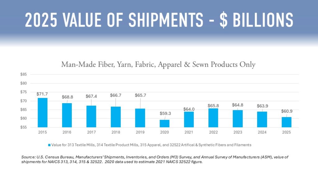 In 2025, the value of U.S. man-made fiber and filament, textile, and apparel shipments totaled an estimated $60.9 billion.