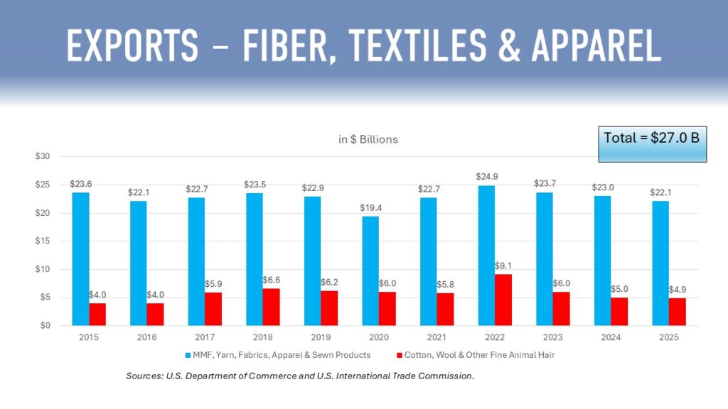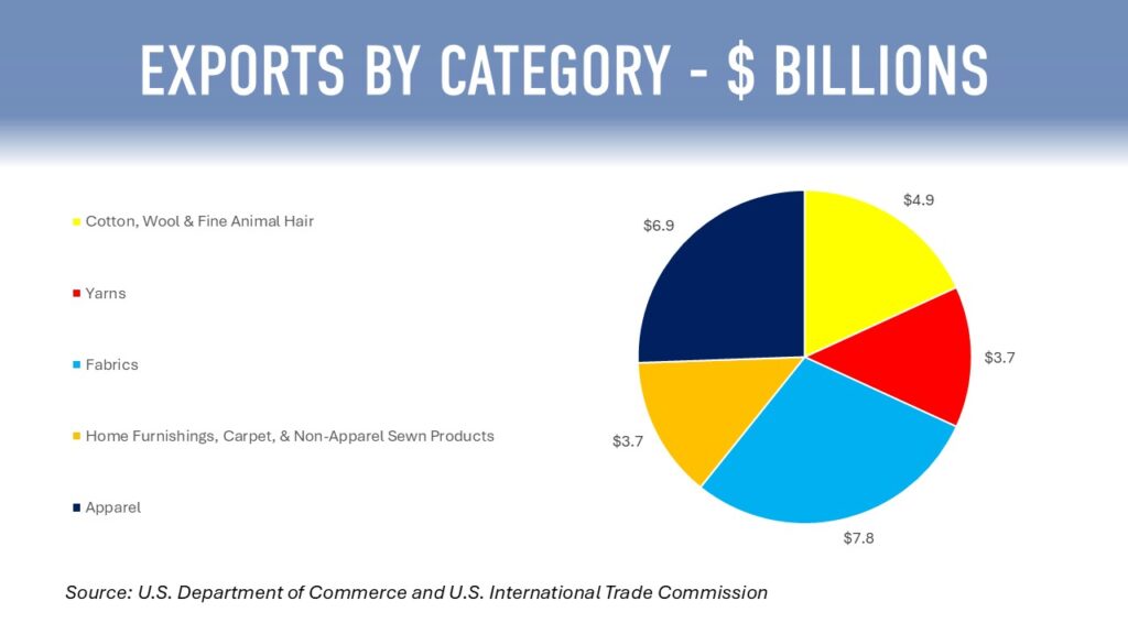 Excluding apparel, the U.S. has a strong export position in fiber, yarns, and fabrics. Exports of those products totaled $28.0 billion alone in 2024, making America one of the top individual country exporters of fiber and textile products in the world.