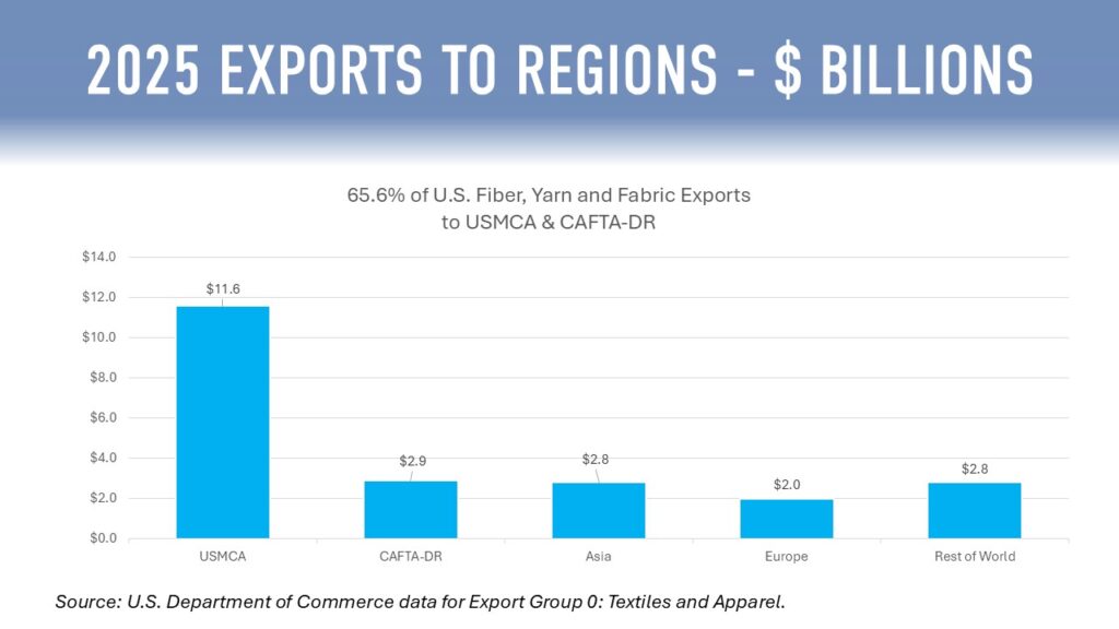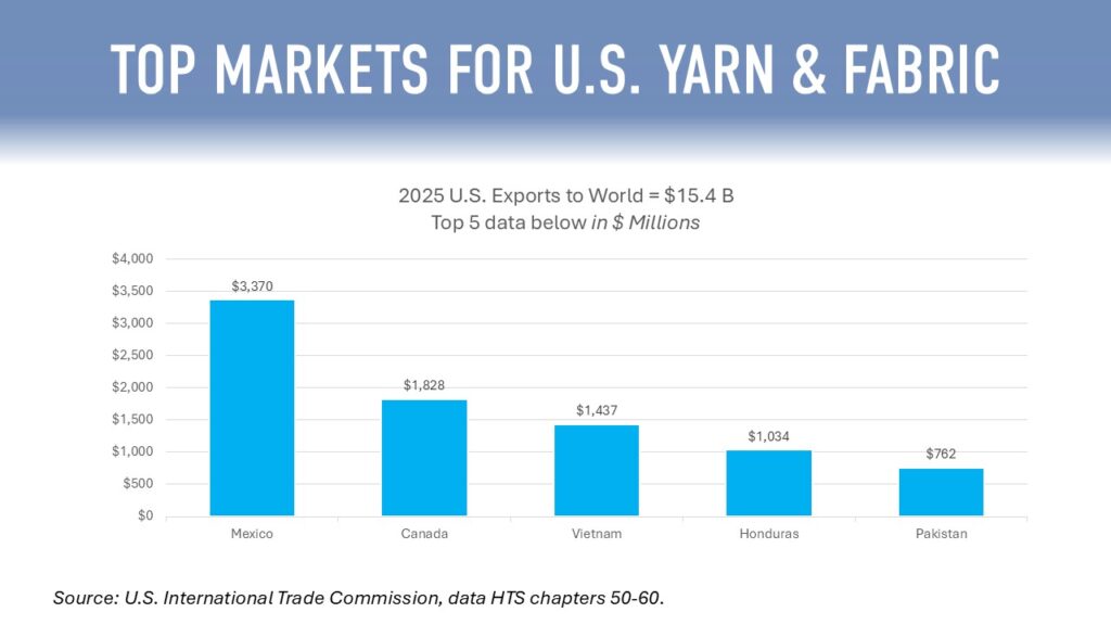 Focusing solely on America’s $16.1 billion in man-made fiber, yarn, and fabric exports, the countries buying the most product are: